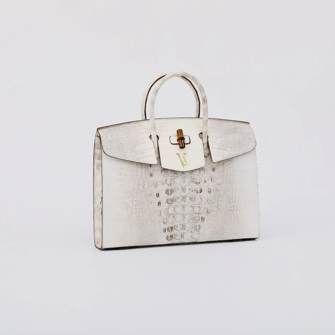 Its gracefully arched bamboo handle, hand-carved and fire-polished to a soft sheen, evokes the spirit of tropical craftsmanship and natural elegance. The signature gold VS insignia sits proudly on the front flap — a quiet statement of prestige and authenticity.